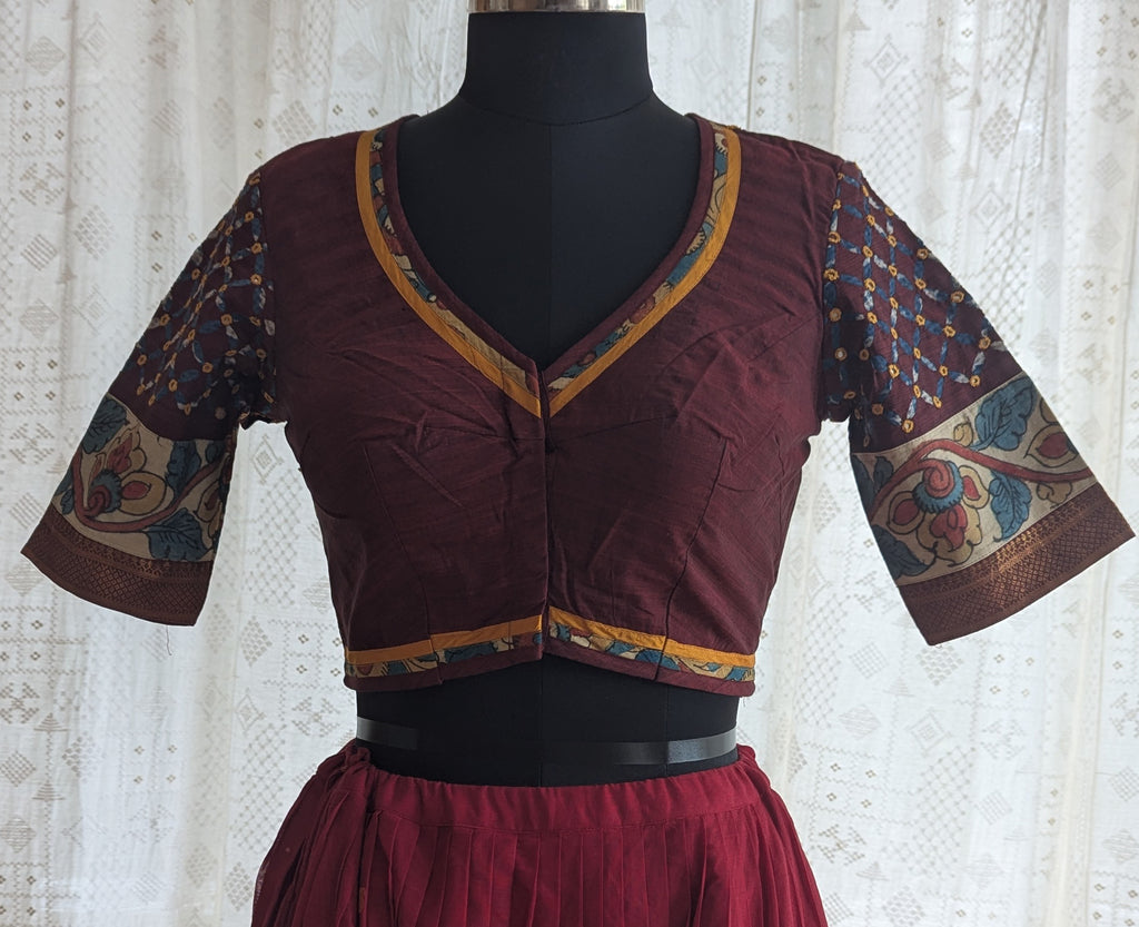 Our Kalamkari blouses celebrate India's rich textile heritage by combining hand-painted Kalamkari art with traditional techniques like embroidery, appliqué, and dyeing. Each piece is thoughtfully crafted using diverse Indian fabrics such as cotton, silk, and khadi. The result is a unique fusion of regional craftsmanship, bringing timeless artistry into contemporary fashion.