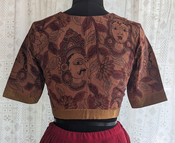The Raja Rani collection features hand-painted kalamkari motifs of royal figures on rich Mangalgiri cotton. With earthy tones and timeless artistry, these blouses bring a regal charm to every drape.